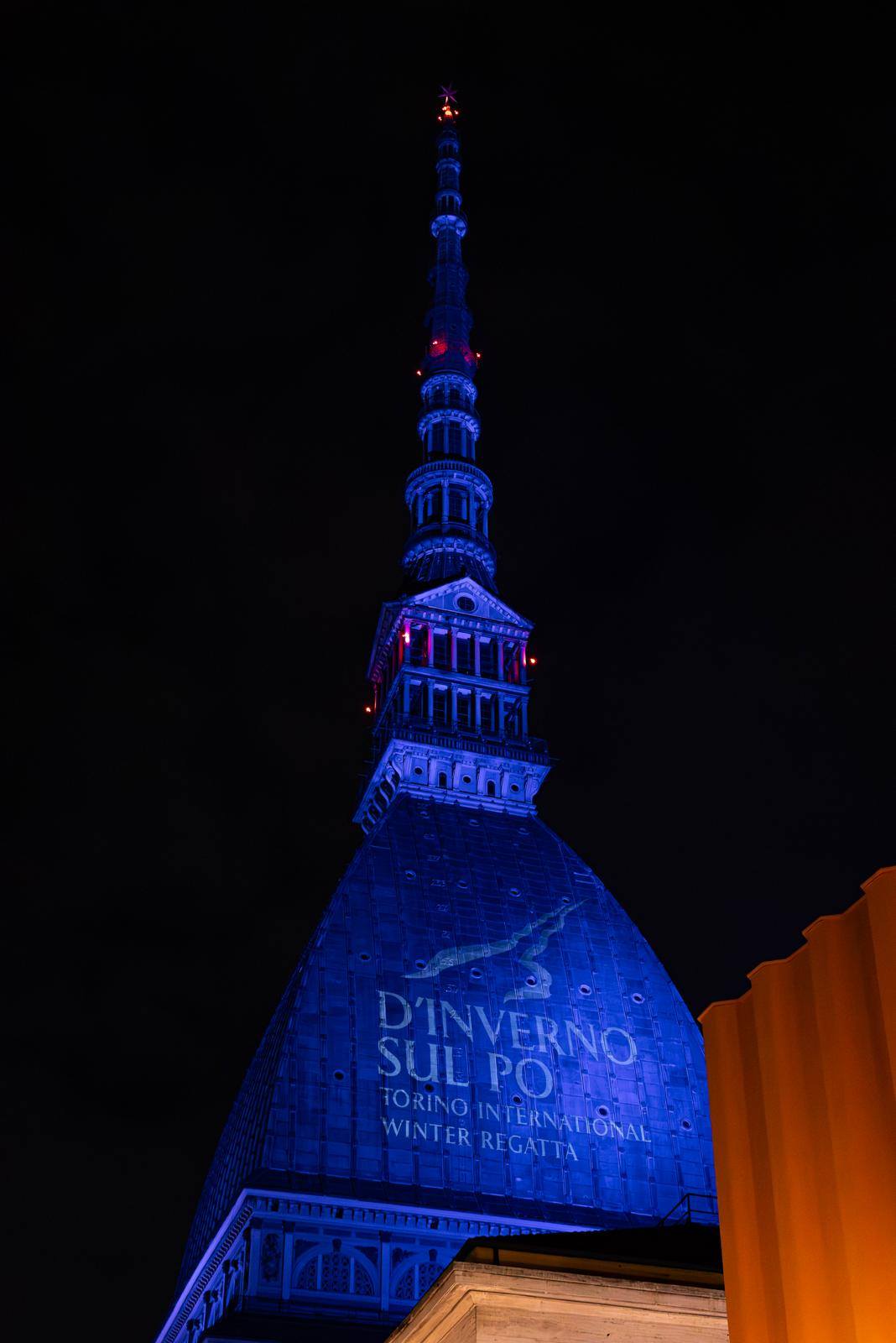 The Mole Antonelliana, symbol of Turin, is an impressive 167‑meter‑high building designed by Alessandro Antonelli in the 19th century. Today it houses the National Cinema Museum and is one of Italy’s most iconic landmarks. In this photo, it is beautifully illuminated in honor of the rowing regatta D’Inverno sul Po.
